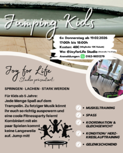 Im Joy for Life Studio erwartet euch ein unvergessliches Abenteuer voller Spaß und Bewegung. Ab dem 19. Februar 2026 könnt ihr jeden Donnerstag von 17:00 bis 18:00 Uhr an unserer energiegeladenen Trampolin-Fitnessparty teilnehmen.