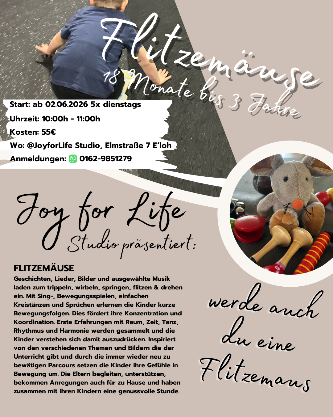 Manchmal sind es die kleinsten Schritte, die die größte Entwicklung anstoßen. Genau hier setzt das liebevoll gestaltete Kursangebot „Flitzemäuse“ vom Joy for Life Studio an. Ein Ort, an dem Kinder im Alter von 18 Monaten bis 3 Jahren spielerisch ihre Welt entdecken – mit Bewegung, Musik und ganz viel Freude.