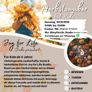 Am Samstag, den 04.10.2025, öffnet das Joy for Life Studio seine Türen für Kinder ab 4 Jahre, um eine bunte und kreative Herbstzeit zu erleben. Von 11:00 bis 13:00 Uhr gibt es ein vielfältiges Programm voller Bewegung, Entspannung und Kreativität. Gemeinsam basteln wir etwas Schönes und genießen die herbstliche Atmosphäre.