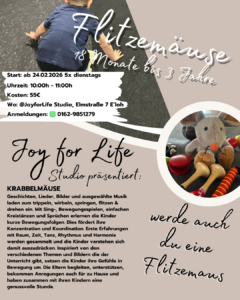 Im Joy for Life Studio in E’loh startet am 24. Februar 2026 ein spannender Kurs für die Kleinsten unter uns: die Flitzemäuse! Kinder im Alter von 18 Monaten bis 3 Jahren sind eingeladen, jeden Dienstag von 10:00 bis 11:00 Uhr eine Stunde voller Spaß und Bewegung zu erleben.